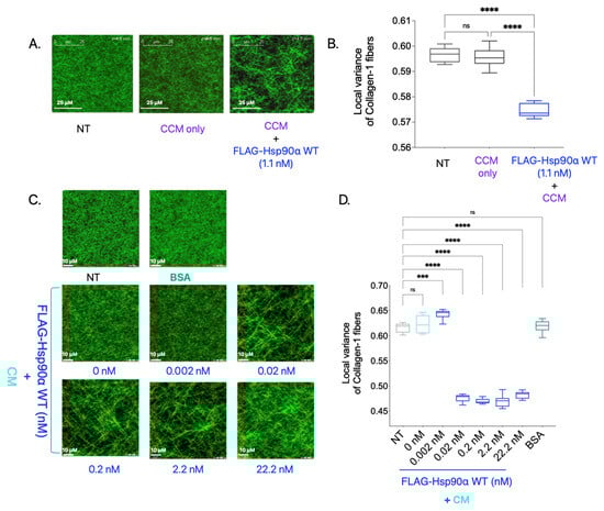 To verify Hsp90 as a primary driver of the Collagen-1 alignment observed in the previous experiment, we added varying FLAG-Hsp90α WT concentrations along with CM instead of 10× CCM to the polymerized Collagen-1 gels and performed SHG imaging and 3D directional variance analysis (Figure 2C,D). Collagen-1 gels treated with BSA (11 nM) were used as a negative control. We observed that the CM treatment of the Collagen-1 gel alone did not result in Collagen-1 alignment compared with the NT Collagen-1 gel. However, with an increasing concentration of Hsp90 along with CM, we observed an increase in the Collagen-1 fiber alignment starting at concentrations as low as 0.02 nM compared with NT. We also observed saturation in Collagen-1 fiber alignment at the 0.02 nM FLAG-Hsp90α WT concentration. The saturation of Collagen-1 fiber alignment at such a low concentration point to Hsp90’s efficacy at Collagen-1 fiber alignment in the presence of extracellular factors secreted by breast cancer cells in the CM. This result validates the novel finding that Hsp90, in conjunction with other factors secreted by breast cancer cells, aligns the Collagen-1 fibers efficiently.