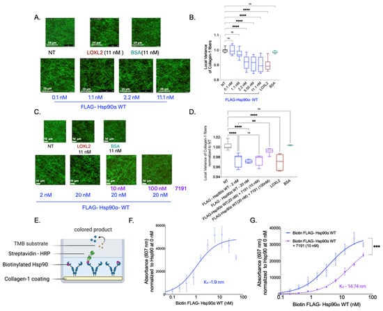 To further confirm the specificity of Hsp90’s activity in aligning Collagen-1, we investigated the direct binding of Hsp90 to Collagen-1. We added biotinylated FLAG—Hsp90α WT protein to Collagen-1-coated wells and utilized biotin–streptavidin (conjugated with HRP) binding to measure the binding of Hsp90 to Collagen-1 (Figure 3E). We observed a direct correlation between the concentration of biotinylated FLAG-Hsp90α WT and its binding to Collagen-1, with a low dissociation constant (Kd) value of 1.9 nM, indicating specific and tight binding (Figure 3F). Interestingly, the Kd value of 1.9 nM for Hsp90 binding to Collagen-1 corresponds well to the Hsp90 concentration of 2.2 nM, at which Collagen-1 alignment significantly increased compared with the NT treatment. Furthermore, we examined the impact of inhibiting Hsp90 using 7191 on Collagen-1 binding (Figure 3G). We observed that the combined treatment of 7191 and FLAG-Hsp90α WT at each concentration resulted in lower absorbance values compared with the corresponding concentration of the FLAG-Hsp90α WT-only treatment. These findings demonstrate the specificity and high affinity of Hsp90 binding to Collagen-1 and its effectiveness in aligning Collagen-1 fibers.
