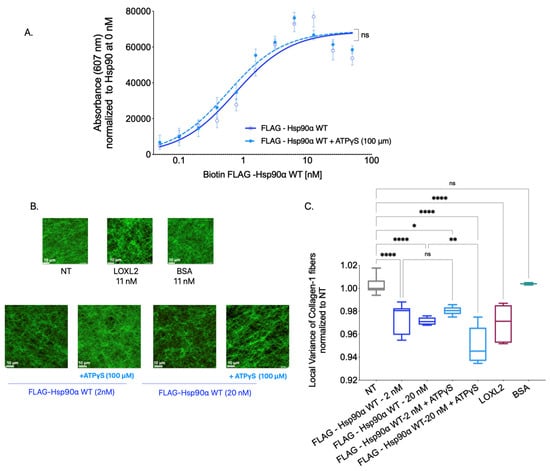 Prior to starting the Collagen-1 binding assay, 100 μg of protein was biotinylated using an Abcam biotinylation kit (Abcam Ab201795, Cambridge, UK) following the manufacturer’s protocol. Once biotinylated, excess unbound biotin was removed, and the biotinylated protein was concentrated to 0.5 mg/mL using Abcam’s antibody concentration and cleanup kit (Abcam Ab102778). For the Collagen-1 binding assay, the surface of the 96-well plate was coated using rat tail Collagen-1 diluted in 0.1% acetic acid to twice the desired concentration to be used and neutralized with an equal volume of neutralization buffer (10× PBS, 0.4 M NaOH,250 mM HEPES, dH2O) [] to form a final Collagen-1 solution of 0.02 μg/μL with 1X PBS and 25 mM HEPES. Subsequently, 50 μL of Collagen-1 solution was added to each well. Collagen-1 polymerization was carried out for 2 h at 37 °C. The plates were dried in a vacuum chamber under sterile conditions overnight to obtain a coated surface. If not immediately used, the plates were stored at 4 °C and used within five days. The plates were washed three times with 1X PBS before the experiment. Next, the plates were blocked using a no-protein blocking buffer (Pierce 37572, Appleton, WI, USA) for 1 h at RT. After blocking, 50 μL of PBS containing proteins and inhibitors was added to each well of the plate, and the plates were incubated for 1 h at RT with gentle rocking. After an hour, the plate(s) were washed with ELISA wash buffer (PBS with 0.1% Tween pH 7.4) 7–8 times. The plate was then treated with streptavidin–HRP (1:150,000) in 50 μL ELISA wash buffer and incubated for 30 min at RT. The washes were repeated 7–8 times. Next, 50 μL of TMB substrate (Thermo Fisher TMB N301) was added, and the absorbance was immediately read at 607 nm. The absorbance values were averaged, and the raw average absorbance values were normalized to the 0 nM FLAG-Hsp90α (containing only PBS) absorbance values.