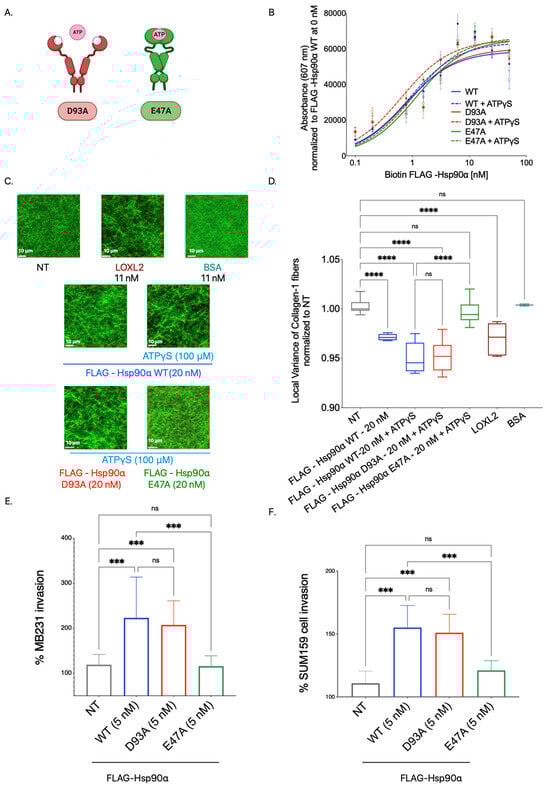 Hsp90’s binding to Collagen-1 is independent of its conformation, but open conformation is essential for aligning Collagen-1 fibers and breast cancer cell invasion through Collagen-1. (A). Schematic of Hsp90’s conformation mutants. (B). Collagen-1 binding assay with biotinylated FLAG-Hsp90α WT, D93A, and E47A with and without ATPγS (100 μM). Absorbance measured at 607 nM is normalized to the absorbance of FLAG-Hsp90α WT at 0 nM. One-way ANOVA p < 0.0001. (C). The conditions were prepared in PBS with and without ATPγS (100 μM) and added to wells containing polymerized Collagen-1 gels. SHG images were acquired spanning a vertical distance of 70 μm (starting at 200 μm above the base of the gel) with 1 image/1 μm. The images shown are representative images of the average intensity projection of z-stacks of images acquired via SHG. The white line in the images depicts 10 μm. (D). Quantification of local variance in Collagen-1 fiber alignment (one-way ANOVA with Tukey’s correction for multiple comparisons, p < 0.0001). p value for pairwise comparison is represented as follows—p < 0.1234 as “NS”, p < 0.0001 as “****”. (E,F). Collagen-1 Transwell invasion assay with MB231 cells and SUM159 cells. Invaded cells were imaged and counted. p value for pairwise comparison is represented as follows—p < 0.1234 as “NS”, p < 0.0002 as “***”. (E). Collagen-1 Transwell invasion assay with MB231 (one-way ANOVA; p = 0.0088). (F). Collagen-1 Transwell invasion assay with SUM159 cells (one-way ANOVA; p = 0.001).