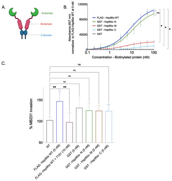 Hsp90 binds to Collagen-1 via the N-domain, but separate domains are insufficient to increase cancer cell invasion through Collagen-1. (A). Schematic of Hsp90 structure and its domains. (B). Collagen-1 binding assay with purified GST-tagged Hsp90 domain proteins. Absorbance measured at 607 nM is normalized to the absorbance of FLAG-Hsp90α WT at 0 nM. One-way ANOVA p = 0.0077. p value for pairwise comparison is represented as follows—p < 0.1234 as “NS”, p < 0.0332 as “*”. (C). Collagen-1 Transwell invasion assay with MB231 cells treated exogenously with GST tagged N, M, and C domains of Hsp90. One-way ANOVA was performed with Tukey’s correction; p-value—0.0010. p value for pairwise comparison is represented as follows—p < 0.1234 as “NS”, p < 0.0021 as “**”.