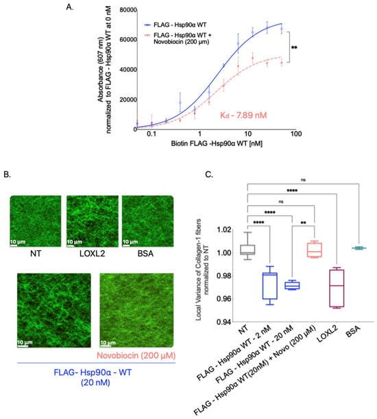 In the Collagen-1 binding assay, we treated Collagen-1-coated plates with FLAG-Hsp90α WT alone or in combination with novobiocin (200 μM) to determine the effect of dimerization inhibition on Hsp90’s binding to Collagen-1 (Figure 7A). We observed that the presence of novobiocin reduced the binding of FLAG-Hsp90α WT to Collagen-1 compared with FLAG-Hsp90α WT alone, indicating that the inhibition of dimerization through the C-terminal binding of novobiocin reduces Hsp90’s binding capacity to Collagen-1.
