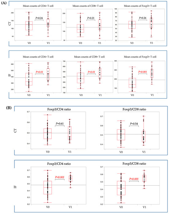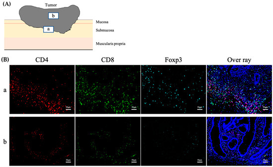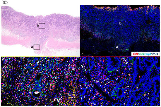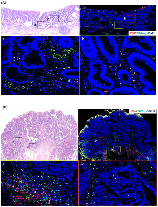 - Shinto, E.; Hase, K.; Hashiguchi, Y.; Sekizawa, A.; Ueno, H.; Shikina, A.; Kajiwara, Y.; Kobayashi, H.; Ishiguro, M.; Yamamoto, J. CD8+ and FOXP3+ Tumor-Infiltrating T Cells Before and After Chemoradiotherapy for Rectal Cancer. Ann. Surg. Oncol. 2014, 21, S414–S421. [Google Scholar] [CrossRef] [PubMed]
