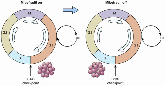 The potential of one T-type Ca2+ channel inhibitor, mibefradil, to increase survival in combination with temozolomide in an animal model of glioblastoma multiforme was demonstrated [20]. The strategy of that study is displayed in Figure 1. First, when the tumor cells were treated with mibefradil (“mibefradil on”), they were synchronized in G1 because the blockage of Ca2+ influx prevented progression beyond the G1/S checkpoint. Subsequently, after mibefradil was withdrawn (“mibefradil off”), synchronized cells re-entered the cycle and progressed from G1 to S phase, which increased the size of the S phase fraction. Tumor cells in S phase are more responsive to chemotherapy.