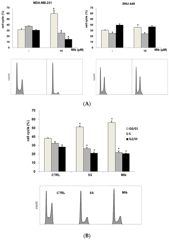(A) Cell cycle distribution changes induced by mibefradil treatment in PC-3 (human prostate adenocarcinoma), SK-N-SH (human neuroblastoma), MDA-MB-231 (human breast cancer), and SNU-449 (human hepatocellular carcinoma) cells. (B) Comparison of the cell cycle distribution after serum starvation and mibefradil treatment. The data are presented as the mean and standard error of three independent experiments. * p < 0.05. CTRL = control, SS = serum starvation, Mib = mibefradil.