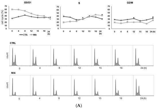 However, unlike 24 and 48 h treatment, 72 h mibefradil treatment resulted in a significant increase in [3H] DDG uptake at 15–24 h after mibefradil withdrawal (Figure 3D). Compared with control cells, the [3H] DDG uptake by treated cells was 118.1% at 15 h (p = 0.030), 128.5% at 18 h (p = 0.021), and 140.1% at 24 h (p = 0.001). In the cell cycle analysis, the S fraction of treated cells was larger than that of control cells at 18 (35.3% ± 1.1% vs. 25.2% ± 0.7%) and 24 h (34.5% ± 0.9% vs. 25.7% ± 1.3%), whereas the G0/G1 fraction was smaller at 18 (45.7% ± 0.5% vs. 55.2% ± 0.7%) and 24 h (42.2% ± 1.0% vs. 57.1% ± 0.7%) (Figure 3C).