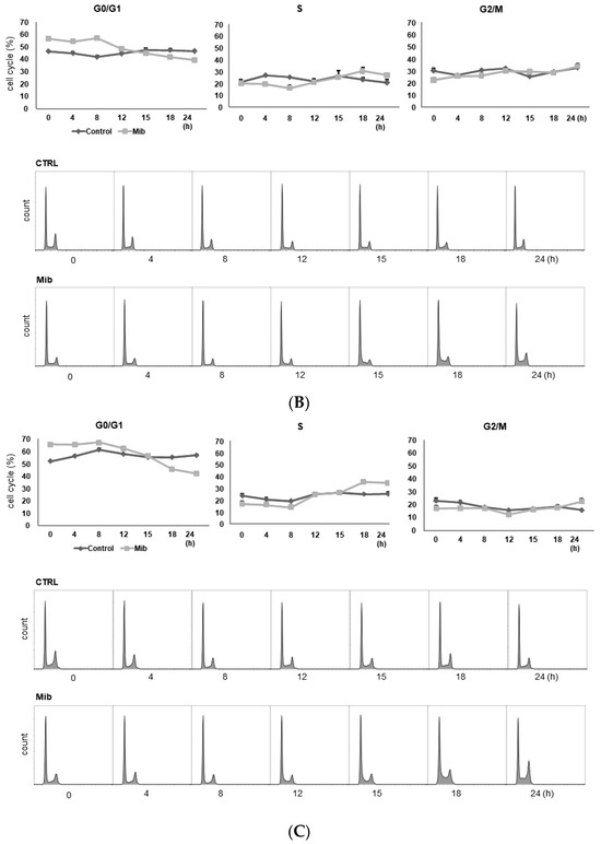 For cell cycle analysis, 5 × 104 (PC-3, MDA-MB-231, and SNU-449) or 1 × 105 (SK-N-SH) cells were seeded on 12-well plates and grown before mibefradil treatment. Mibefradil was added to each well at a final concentration of 5 (SK-N-SH) or 10 μM (PC-3, MDA-MD-231, and SNU-449) and incubated for 1–3 days. Cells were washed twice with phosphate-buffered saline (PBS) and supplied with fresh medium to eliminate the effect of mibefradil. For control cells, all procedures followed those used for treated cells except that vehicle was added instead of mibefradil. Cells were collected by trypsinization at 0, 4, 8, 12, 15, 18, and 24 h after mibefradil withdrawal and rinsed twice with 5 mL of PBS containing 0.1% bovine serum albumin. After centrifugation, cells were fixed by dripping 3 mL of cold 70% ethanol onto the cell pellets and stored in a 4 °C refrigerator until analysis. After overnight fixation, all samples were centrifuged and washed twice with PBS. Then, cells were resuspended in propidium iodide (PI) staining solution (0.1% (v/v) Triton X-100, 10 μg/mL PI, and 100 μg/mL DNAse-free RNAse A in PBS) and incubated at room temperature for 30 min in the dark. Cellular fluorescence cells were measured using the flow cytometer (BD FACSCalibur™, San Jose, CA, USA). Data were analyzed using Flowjo software (ver 7.2.4, Tree Star Inc., Ashland, OR, USA).