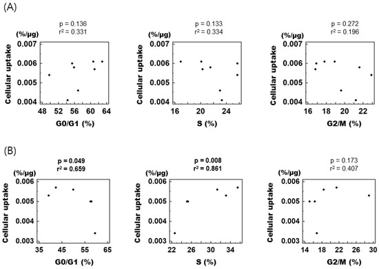 To assess the relationship between individual cell cycle fractions and cellular [3H] DDG uptake, control and treated cells were combined according to their respective cell cycle phase and then divided into early (0–12 h) and late phases (15–24 h) of cell cycle synchronization. In the early phase, [3H] DDG uptake displayed no correlation with any of the cell cycle fractions (Figure 4A), whereas in the late phase, it showed a positive correlation with the S fraction (r2 = 0.861, p = 0.008) and a negative correlation with the G0/G1 fraction (r2 = 0.659, p = 0.049, Figure 4B).