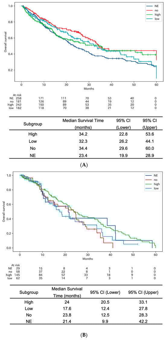 Our study further scrutinized the role of PD-L1 expression levels in influencing the OS outcomes among NSCLC patients. Figure 5A delineates the Kaplan–Meier curves for OS across four distinct PD-L1 expression categories: high, low, not evaluated (NE), and no expression (no). Statistical analysis using the log-rank test yielded a significant p-value of 0.0167. This indicates the importance of PD-L1 expression levels in determining survival outcomes in NSCLC.