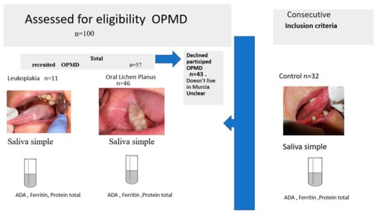 The present case–control study was designed according to the Strengthening Reporting of Observational Studies in Epidemiology (STROBE) guidelines. Salivary biomarkers in patients diagnosed with OPMD (oral lichen planus and oral leukoplakia) and healthy individuals were analyzed and compared.