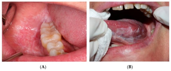 Potentially malignant oral lesions. (A) Oral lichen planus on the buccal mucosa. (B) Oral leukoplakia on the ventral surface of the tongue.