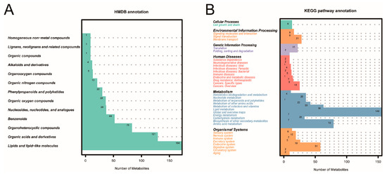 The annotation of metabolites from 30 GC patients. (A) The annotation in the HMDB database. (B) The annotation in the KEGG database.