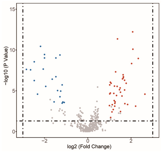 Metabolites were annotated using the HMDB database (https://hmdb.ca/metabolites, accessed on 15 May 2020). Principal components analysis (PCA) and partial least squares discriminant analysis (PLS-DA) were performed to obtain the overall distribution trend of the tissues and differential metabolites using metaX, a flexible and comprehensive software for processing metabolomics data. The t-test and PLS-DA were used to screen the differential metabolites coordinately with the filtered conditions of the variable importance for the projection (VIP) > 1.0, fold change (FP) 2.0 or <0.5, and p < 0.05.