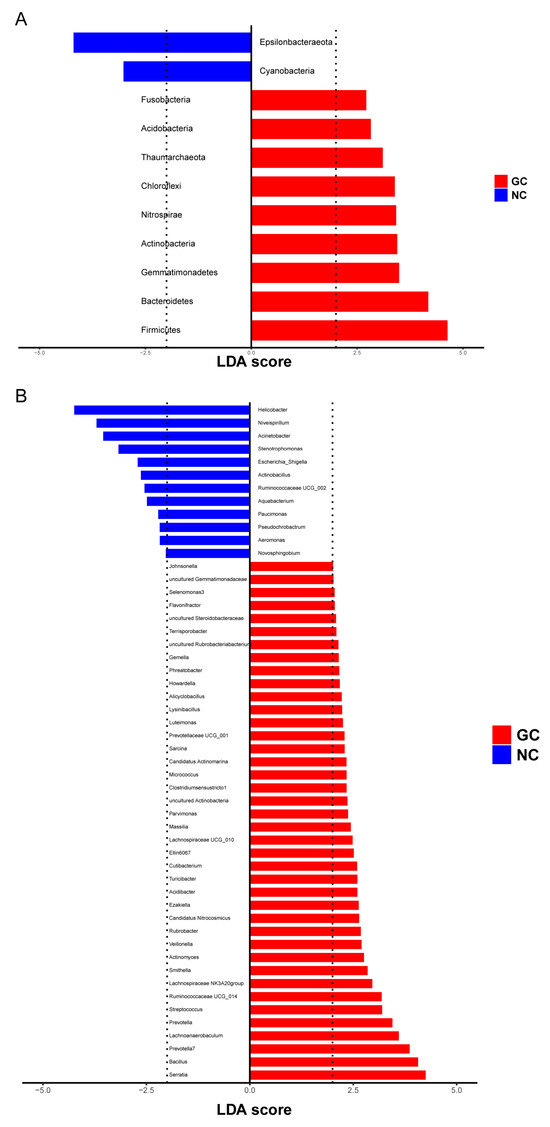 Differential microbe in phyla and genera between GC tissues and NC tissues by LefSe. (A) Differential phyla between GC tissues and NC tissues. (B) Differential genus between GC tissues and NC tissues.