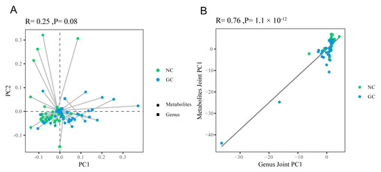 To explore the relationship between metabolomics and the microbiome in GC, Procrustes analysis was performed to analyze the overall correlation between these two datasets (1659 metabolites and all genera by 16S rRNA sequencing), showing an overall similarity with no statistical significance (Figure 5A). After two-way modeling of the two omics matrices by the O2PLS model, we found that the metabolomics data matrix was highly correlated with the microbiome (r = 0.76, p < 0.05, Figure 5B), which provided a foundation for further association analysis.