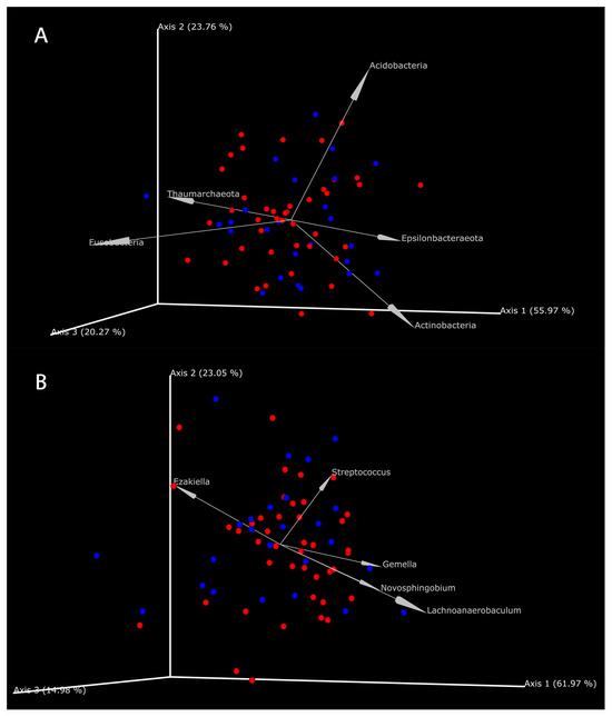 The coexistence relationship of differential metabolites with differential microbes. (A) The coexistence relationship of differential metabolites with differential phyla. (B) The coexistence relationship of differential metabolites with differential genus. Each figure showed the top 5 differential microbes. Red points represent the enriched metabolites in GC tissues; blue points represent the enriched metabolites in NC tissues. The smaller the angle between points and arrows, the greater the possible coexistence relationship between microbes and metabolites.