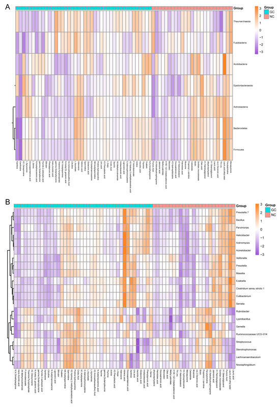 To further explore the coexistence relationships between the metabolites and microbes and to find the microbial-related metabolites in the GC tissues and the NC tissues, mmvec [31] analysis evaluated the conditional coexistence probability of differential metabolites with specific differential microbes, using a neural network algorithm for discovering the interaction distribution between differential metabolites and microbes. Differential microbes (11 differential phyla and 52 differential genera) were obtained from the LEfSe results, and differential metabolites (67 differential metabolites) were obtained from the strict analysis of the PLS-DA and the rank sum test results. At the level of bacteria phyla, Acidobacteria, Fusobacteria, Actinobacteria, Thaumarchaeota, Epsilonbacteraeota, and seven other phyla existed simultaneously with each other and might coexist with 62 metabolites. At the level of the bacteria genera, 21 genera (e.g., Actinomyces, Bacillus, Gemella, Prevotella, and Helicobacter) might coexist with 63 differential metabolites. Of these differential metabolites, only xanthosine had no coexistence relationship with any genus or phyla (Table S4). The top five coexisting phyla and genera are shown in Figure 6 and Figure S5. The coexistence probability of each metabolite and microbe is presented in Figure 7. The greater the positive conditional probability value, the greater the probability of coexistence.