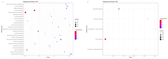 The KEGG pathway enrichment analysis of 66 microbial-related metabolites. (A) The KEGG pathway enrichment for microbial-related metabolites enriched in GC tissues. (B) The KEGG pathway enrichment for microbial-related metabolites enriched in NC tissues.