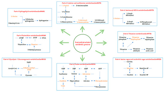 Eight major microbial-related metabolism-based biological partial processes in GC. Metabolites (yellow texts) were microbial-related metabolites hit on KEGG pathways by enrichment analysis, as well as ones mediated by differential microbiota.