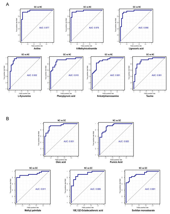 The ROC of microbial-related differential metabolites with high diagnostic efficiency (AUC > 0.9). (A) Seven microbial-related differential metabolites enriched in GC tissues for diagnosing GC. (B) Five microbial-related differential metabolites enriched in NC tissues for diagnosing NC.