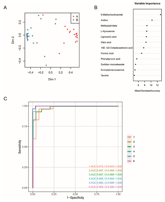 The random forest and ROC of microbial-related differential metabolites in the diagnosis of GC. (A) The random forest model. (B) The importance-ranking of microbial-related differential metabolites. (C) The combined diagnostic efficacy of microbial-related differential metabolites. For example, the number 6 represented the combined of top 6 microbial-related differential metabolites.