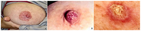 MPD typically presents as unilateral NAC cutaneous changes, including nipple itching, erythema/eczematous lesions, erosion/ulceration, nipple retraction, and serous/bloody discharge, individually or in combination [1] (Figure 3). Lesions usually arise from the nipple and spread to involve the surrounding areola complex [32], but cases of perimammary skin and opposite breast disease extending have also been reported [33,34,35]. Pain, itching, and a burning sensation occur in 15–25% of cases and often precede physical manifestation [36,37]; ulceration, bleeding from the nipple, and serous discharge destruction may occur in advanced stages [38]. A palpable mass may or may not be revealed to clinical examination and is usually correlated with the patients’ outcomes [38]. The mass is typically centrally located, although it can also be situated on the periphery of the breast in up to 41% of cases, showing a multifocal or multicentric localization [5,11], according to the capacity of the PC to propagate via the ducts.
