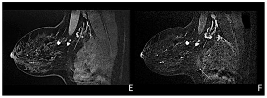 US is a non-invasive, repeatable, and widely available technique. Its inclusion in the initial assessment could benefit and warrants consideration, mainly when DM yields negative results, especially in women with denser breast tissue. Similar to mammographic MPD findings, US alterations are nonspecific and include expected changes for BC treatments, including hypoechogenic masses, microcalcifications, ductal ectasia, NAC flattening, asymmetry, and thickening [26,47,48] (Figure 5). Additionally, US offers an option of immediate image-guided intervention and improves the diagnostic accuracy for axillary lymph node status. However, not all underlying BC can be identified through the US. MRI’s higher sensitivity in evaluating the retroareolar region provides crucial information for clinically evident MPD cases with occult findings in DM and US and for the preoperative assessment of disease extent in patients eligible for breast-conserving therapy [26,47]. In addition, thanks to contrast enhancement, it shows nipple involvement [49]. MRI findings include asymmetric and abnormal NAC enhancement patterns, sometimes associated with non-mass-like enhancement or suspicious masses elsewhere in the breast [26,47,50], even a distant site with no apparent anatomic connection, about possible MPD multifocality and multicentricity (Figure 6). MRI may also evaluate lymph node status, raising concerns about axillary or internal mammary involvement. However, it is essential to note that false-negative MRI results for NAC evaluation in MPD cases have also been reported [25,50], probably for less-aggressive disease forms. Therefore, all clinically suspicious findings must undergo biopsy, regardless of negative imaging results. A full-thickness NAC biopsy with histological and immunohistochemical evaluation is the gold standard for establishing an ultimate diagnosis [38]. Research examining the molecular markers in MPD cases has revealed an expression of HER-2/neu, cytokeratin 7 (CK7), mucin 1 (MUC1), and human milk fat globule, and positive staining with CAM 5.2 antibody [51,52]. Exfoliative cytology with PC demonstration may be helpful, but a negative result can occur; its use has been postulated as an easy screening test for eczematous skin changes to the nipple.