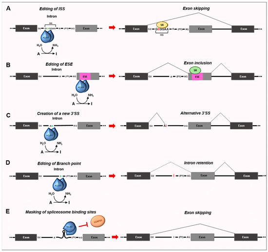 Schematic representation of the impact of RNA editing on the splicing outcome. (A,B) ADAR1 can bind and edit GA-rich motifs within cis-regulatory elements in introns and exons, thus affecting the binding of RNA-binding proteins. In particular, the A-to-I editing can empower the binding capacity of SR proteins, leading to exon skipping when the editing occurs in ISS (A), or exon inclusion when an ESE is edited (B). (C) Modification of AA sites within introns can result in AI mimicking AG and being recognized as new acceptor splice sites. (D) Deamination of the branch point adenosine can impair intron removal. (E) ADAR2 binding to dsRNA structures formed between GA-rich sequences located upstream of the poly-pyrimidine tract can sterically inhibit the access of U2AF65, thus preventing exon recognition. Abbreviations: SR, serine, and arginine-rich proteins; ISS, intronic splicing silencer; ESE, exonic splicing enhancer; Py, polypyrimidine tract; U2AF65, U2 small nuclear ribonucleoprotein auxiliary factor 65.