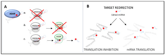 Editing of miRNA precursors displays significant implications on miRNA fate and function, affecting both the expression of the miRNA and its ability to recognize target sequences (Figure 3 and Table 3). A-to-I editing of miRNA precursors can alter their primary structure, as reported for over 550 human miRNA transcripts [83], and lead to structural conformation changes which can prevent Drosha or Dicer from processing them (Figure 3A). MiRNA molecules are synthesized as long RNA primary transcripts known as pri-miRNAs, which are then cleaved by Drosha to produce a characteristic stem-loop structure of about 70 base pairs long, known as a pre-miRNA. DGCR8 is essential for Drosha activity and is capable of binding single-stranded fragments of the pri-miRNA that are required for proper processing (Figure 3A) [84]. Pre-miRNAs are further processed into mature miRNAs by the RNase dicer (Figure 3A) [84]. A-to-I RNA editing can prevent the processing of pri- or pre-miRNAs. However, in certain cases, the A-to-I editing event does not impair miRNA biogenesis, and the edited nucleotide is maintained in the mature miRNA. Since miRNA-mediated translational repression is conferred by sequence complementarity between miRNA seed regions and seed-complementary sequences within the target mRNA, even a single nucleotide substitution along the mature miRNA sequence can determine changes in its target repertoires, causing target redirection, in which novel miRNA targets are created and/or complementarities between miRNAs and the UTRs of canonical targets are destroyed [85] (Figure 3B).