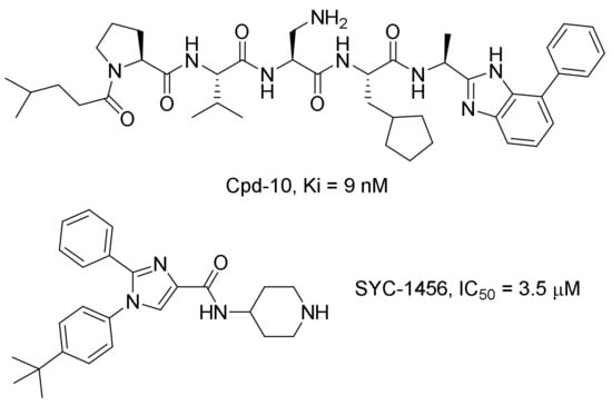 Two series of compounds have been reported to inhibit the AF9/ENL-DOT1L interactions, including our previously disclosed compound SYC-1456 [26] and a series of 7-mer peptidomimetic compounds derived from DOT1L, such as Cpd-10 [33,34] (Chart 1). These compounds can inhibit AF9-DOT1L and other related PPIs and selectively suppress aberrant gene expression and cell proliferation of MLL-r leukemia, showing on-target activities, as well as a need for additional inhibitor discovery and development. Here, we report the discovery, synthesis, structure–activity relationships (SAR) and biological activities of a new chemo-type of inhibitors of the PPIs between AF9/ENL and DOT1L or AF4.