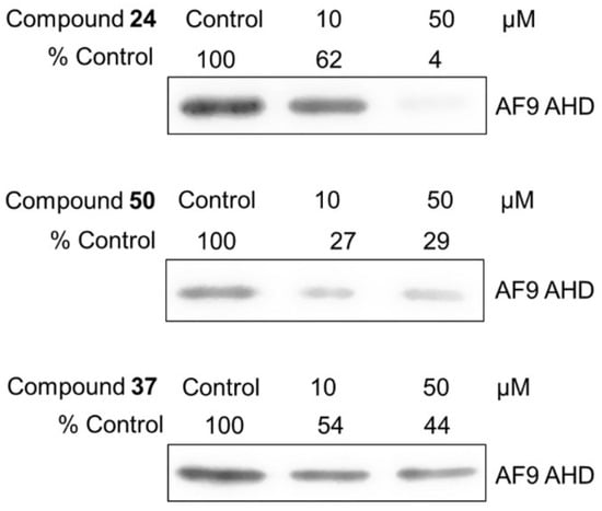 Pull-down assay indicated that compounds 24 and 50 significantly reduced the amounts of AF9 AHD bound to DOT1L peptide-coated resins in a dose-dependent manner, while inactive compound 37 did not significantly affect the AF9 AHD levels. The uncropped bolts are shown in Supplementary Materials.