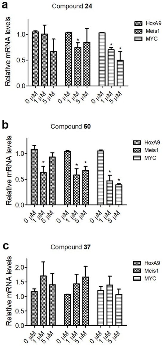 RT-qPCR results of treatment of Molm-13 cells with compounds 24 (a), 50 (b) or 37 (c) at the designated concentrations for 4 days, showing 24 and 50, but not inactive compound 37, inhibited expression of representative MLL target genes HoxA9, Meis1 and Myc at 1 and 5 µM in Molm-13 cells. (* p < 0.05).