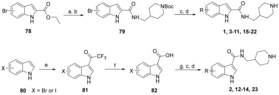 The general synthesis of the indole-carboxamide compounds is shown in Scheme 1. A 5- or 6-bromo-substituted indole-2-carboxylic acid ethyl ester 78 was hydrolyzed and then reacted with tert-butyloxycarbonyl (BOC)-protected 4-aminomethylpiperidine to give an indole-2-carboxamide intermediate compound 79, which was subjected to a Suzuki coupling reaction, followed by deprotection of the BOC, to give the target compounds 1, 3–11 and 15–22. To synthesize indole-3-carboxamide compounds, 5- or 6-bromo- or iodo-substituted indole 80 was reacted with trifluoroacetic anhydride to give 3-trifluoacetyl-indole 81, which was hydrolyzed to provide the corresponding indole-3-carboxylic acid 82. A similar amidation and Suzuki coupling reaction for compound 82 gave, upon BOC deprotection, the target compounds 2, 12–14 and 23.