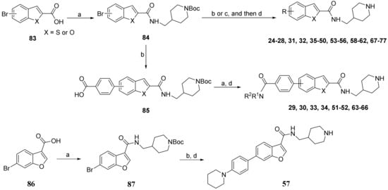 The synthesis of benzothiophene and benzofuran compounds is shown in Scheme 2. A bromo-substituted benzothiophene- or benzofuran-2-carboxylic acid 83 was coupled with BOC-protected 4-aminomethylpiperidine to provide 84, which was subjected to a Suzuki coupling reaction with an aryl boronic acid/ester, or a Buchwald-Hartwig amination reaction with an amine/phenol to give, after deprotection of the BOC, the target compounds 24–28, 31, 32, 35–50, 53–56, 58–62 and 67–77. The carboxylic acid 85, the Suzuki coupling product from compound 84, reacted with an amine to yield, upon removal of the BOC, the final compounds 29, 30, 33, 34, 51–52 and 63–66. Similar transformations from benzofuran-3-carboxylic acid 86 gave compound 57.