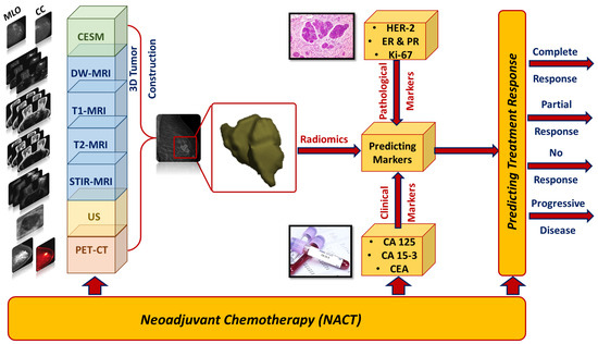 Recently, Artificial Intelligence (AI) and its sub-fields, namely machine learning (ML) and Deep Learning (DL), have assumed an increasingly pivotal role in predicting patients’ responses to treatment, while also optimizing personalized or precision medicine—a paradigm that intricately considers the individuality of each patient. This trend is underpinned by promising outcomes in detecting, diagnosing, and prognosing various cancers. Figure 1 delineates the fundamental constituents of a typical AI-driven treatment response prediction system. This system leverages medical images procured through diverse imaging modalities, encompassing both anatomical and functional perspectives, as its primary model inputs, followed by an intricate radiomics feature extraction procedure. Moreover, the prediction model can be supplemented with clinical markers (e.g., CA 125 and CA15-3), pathological indicators (such as estrogen receptor (ER), progesterone receptor (PR), Ki67 index, and HER2 expression), and treatment alternatives. The ultimate culmination of these inputs is the prediction of the patient’s response to NACT treatment, encompassing potential outcomes like pCR, pPR, PD, or SDNR.