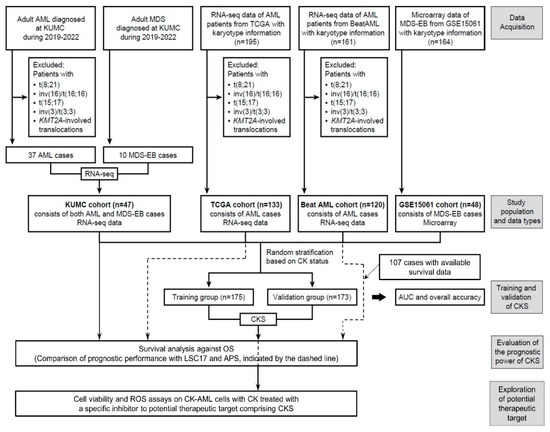 Our cohort (KUMC cohort) included 47 adults diagnosed with AML or MDS-EB. As the definition of CK in previous studies excludes WHO-designated balanced abnormalities, including t(8;21)(q22;q22.1), inv(16)(p13.1q22) or t(16;16)(p13.1;q22), t(15;17)(q22;q11–12), any translocations involving KMT2A [8,10,12,13], and inv(3)(q21.3q26.2) or t(3;3)(q21.3;q26.2) [8], AML patients with above abnormalities were excluded from our study (Figure 1). CK was defined as ≥3 unrelated chromosome abnormalities in both AML and MDS-EB. OS was defined as the time from diagnosis to death, with living patients censored on the date of their last follow-up. This study was approved by the Institutional Review Board of Korea University Guro Hospital (2021GR0572) and was conducted in accordance with the Declaration of Helsinki.