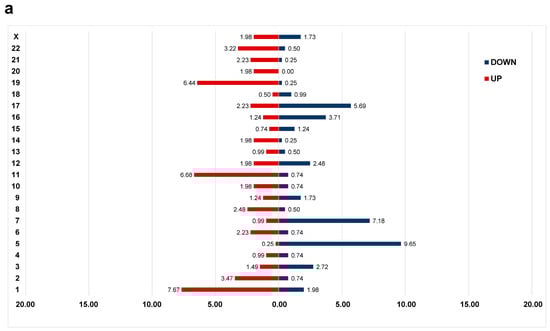 Notably, the downregulated genes were mostly localized on chromosome 5 or chromosome 7 and the upregulated genes were localized on chromosome 1 or chromosome 11 (Figure 2a). When examining the localization of DEGs by chromosome arm, the majority of downregulated genes were found on the long arm of either the chromosome 5 (n = 38, 9.41% of DEGs), chromosome 7 (n = 20, 4.95% of DEGs), or chromosome 17 (n = 17, 4.21% of DEGs). More than half of the DEGs located on the 17q were distributed in the 17q21 band (n = 9), while on chromosomes 5 and 7, DEGs were distributed throughout the long arm. For upregulated genes, 20 genes each (4.9% of DEGs) were located on the long arm of chromosome 11 and short arm of chromosome 1, respectively, and were most frequently observed in the 11q13 (n = 7) and 1p34 (n = 8) bands.