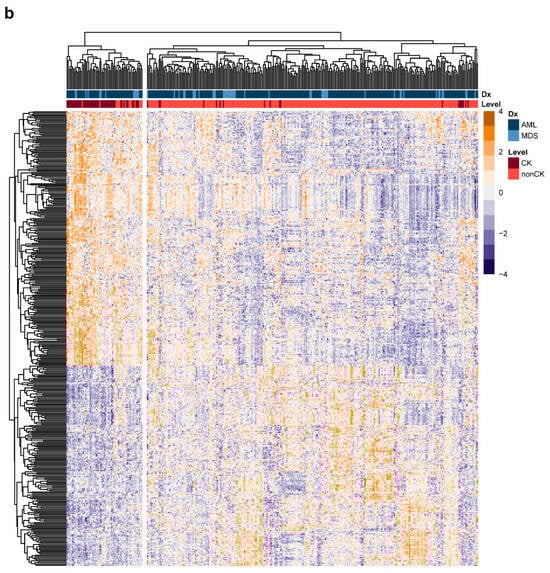 CK, defined as ≥3 unrelated chromosomal abnormalities in both AML and MDS, comprises 10–12% of de novo AML and primary MDS cases [8,9]. CK is associated with a poor prognosis in both AML and MDS. In AML, CK is persistently associated with adverse outcomes and resistance to standard chemotherapy [10,11,12], suggesting that these entities are biologically distinct. Although a high frequency of TP53 mutations is considered the hallmark of CK [13,14], other molecular features of CK, including the transcriptome, are less well characterized, possibly owing to its high genetic complexity.
