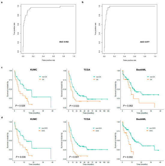 Evaluation results of complex karyotype signature (CKS) classification performance and prognostic impact. LOOCV-estimated AUC of CKS score for predicting CK in the training cohort (a) and validation cohort (b). (c) Kaplan–Meier curves against overall survival (OS) according to CK (orange line) and non-CK (green line) in KUMC (left), TCGA (middle), and BeatAML (right) cohorts. (d) Kaplan–Meier curves against OS according to predicted as CK by CKS (orange line) and non-CKS (green line) in KUMC (left), TCGA (middle), and BeatAML (right) cohorts.