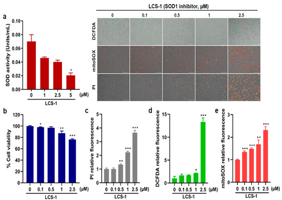 SOD1 inhibitor treatment leads to reduction in AML cell proliferation. (a) Superoxide dismutase (SOD) enzymatic activity (units/mL) measured after treatment with various concentrations (0, 1, 2.5, and 5 μM) of LCS-1 in HL-60. (b) Cell viability (%) measured after treatment with different concentrations (0, 0.1, 0.5, 1, and 2.5 μM) of LCS-1. (c) The production of dead cells detected by fluorescence intensity measured after treatment with LCS-1 and staining with PI. (d) The production of intracellular reactive oxygen species (ROS) detected by fluorescence intensity measured after treatment with LCS-1 and staining with DCFDA. (e) The production of mitochondrial ROS detected by fluorescence intensity measured after treatment with LCS-1 and staining with mitoSOX. The concentrations of LCS-1 used for (c–e) are the same as the concentrations used in b. Bar graphs show mean ± SD of fluorescence intensity quantified by ImageJ. Scale bar represents 100 μm. Statistical analysis: * p < 0.05; ** p < 0.01; *** p < 0.001 vs. untreated control cells.