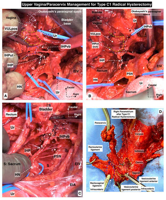 Upper vagina/paracervix management for type C1 radical hysterectomy ((A–C) show the dissection order and surgical steps, (D)—postoperative specimen). The paravaginal space is developed, so the infraureteric paracervix, the posterior leaf of the vesicouterine ligament, is resected superior to the inferior hypogastric plexus vesical branches. (Surgical dissection by author IS) (Ur: ureter, HN: hypogastric nerve, IHP: inferior hypogastric plexus, IHPut: inferior hypogastric plexus uterine branches, VULpos: vesicouterine ligament posterior leaf, IHPvb: inferior hypogastric plexus vesical branches, EIV: external iliac vein, PSN: pelvic splanchnic nerves, EIA: external iliac artery, S: sacrum).