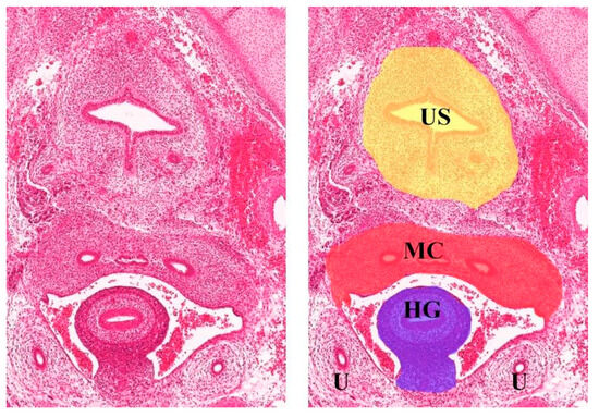 Transverse section of Carnegie stage 23 female embryo (the human histology images were provided by the Joint MRC/Wellcome Trust (MR/R006237/1) Human Developmental Biology Resource (www.hdbr.org, accessed on 8 June 2023; Gerrelli et al. (2015)) reference [37]. HG—hindgut, MC—Mullerian compartment, US—urogenital sinus, U—ureter.