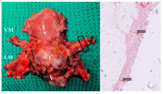 Total mesometrial resection specimen (author’s own material). VM—vascular mesometrium, LM—ligamentous mesometrium, C—cervix, V—vagina. Right picture (black box on left figure) shows fascia that partially covers vascular mesometria.
