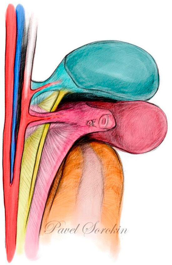 The HN is located between the mesoureter and the ligamentous mesometria proximally [35,36,41]. This concept differs from the Japanese one, where the mesoureter contains the HN [6,11,13]. Distally, the hypogastric nerve fuses with the PSNs and they together form the IHP. The IHP is located between the mesoureter and mesocolpium. For distal mesoureter mobilization, vaginal branches of the IHP should be transected and the bladder branches are preserved [35,36,41]. Conventional anatomy describes mesoureter as a lamina close to the rectum and without a clear ventral border at the ureterovesical junction [8,30]. In ontogenetic anatomy, the mesoureter can be dissected at the ventral side of the vascular mesometrium and up to the bladder. Höckel preserves the hypogastric nerve plane during total mesometrial resection [35,36,41].
