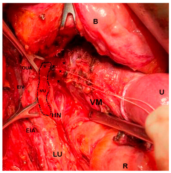 The mesoureter is a mesentery-like structure formed by the fatty neurovascular tissue, which is located posterior to the ureter and contains the HN [5,8,26,28]. The term ureterohypogastric fascia is used for the tissue plane containing the ureter and the hypogastric nerve as the mesoureter [6,11,18]. After the initial dissection of the posterior leaf of the broad ligament, the mesoureter can easily be detached from the rectouterine and rectovaginal ligaments by entering Okabayashi’s (medial) pararectal space [4,11]. The HN can be dissected lateral to the uterosacral (rectouterine) ligament, and the HN together with the dorsocaudal part of the IHP can be dissected lateral to the rectovaginal ligament [4,11].