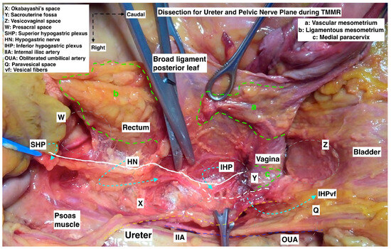 The first space, which is encountered near the VP, is the ureteral space. This space is developed after dissection and separation (craniomedial mobilization) of the parauterine tissue (uterine artery/superficial uterine vein) from the ureter. The zone, limited between the uterine cervix–upper vagina and the ureter, posterior to the parauterine tissue, is the key to accessing the ureteral space [17,18].