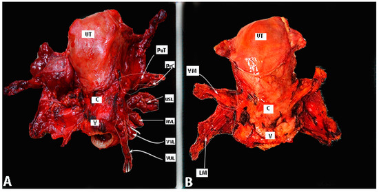 Postoperative specimens after type C1 RH (A) and TMMR (B). Author’s own material. A small part of lymphatic tissue of the paracervix is removed in figure A—the tissue below the ureter and above the deep uterine vein—together with the vein. UT—uterus; C—cervix; V—vagina; PuT—parauterine tissue; PrC—paracervix; USL—uterosacral ligament; RVL—rectovaginal ligament; VUL—vesicouterine ligament; VVL—vesicovaginal ligament; VM—vascular mesometrium; LM—ligamentous mesometrium.