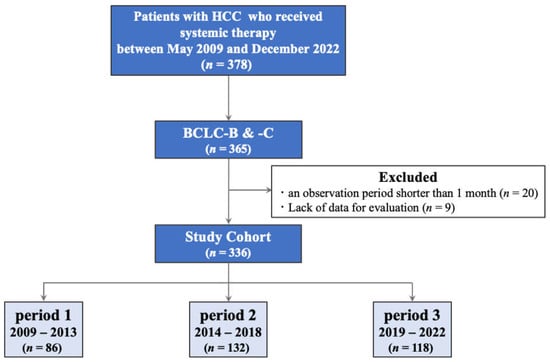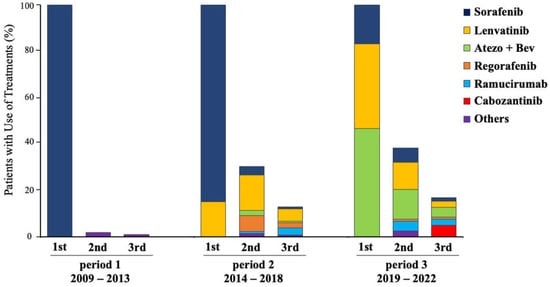 In total, this retrospective study included 336 patients. According to the start date of the first systemic therapy, the patients were divided into the following three groups: period 1, between 2009 and 2013, utility of sorafenib alone; period 2, between 2014 and 2018, availability of regorafenib and lenvatinib in addition to sorafenib; and period 3, between 2019 and 2022, additional approval of ramucirumab, Atezo + Bev, and cabozantinib (Figure 1).