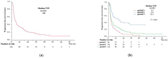 The median TTP was 4.6 months (Figure 3a) and the median OS was 19.9 months (Figure 4a) in the entire cohort. Both the TTP and OS in period 3 were significantly higher than those in the other two periods (median survival time: 14.3 vs. 16.8 vs. 31.0 months, respectively; p < 0.0001) (Figure 3b and Figure 4b). Likewise, the 3-year OS increased from 12.1% for period 1 to 22.0% for period 2 and 44.4% for period 3. The TTP was comparable between periods 1 and 2; however, a significantly gradual improvement in OS was observed in period 2, suggesting that the use of sequential therapy might facilitate this benefit.