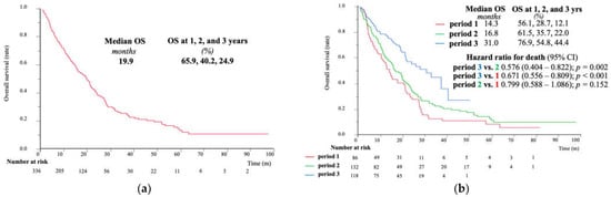 Overall survival of (a) the entire cohort and (b) the three period groups; period 1, 2009–2013; period 2, 2014–2018; period 3, 2019–2022. OS, overall survival.